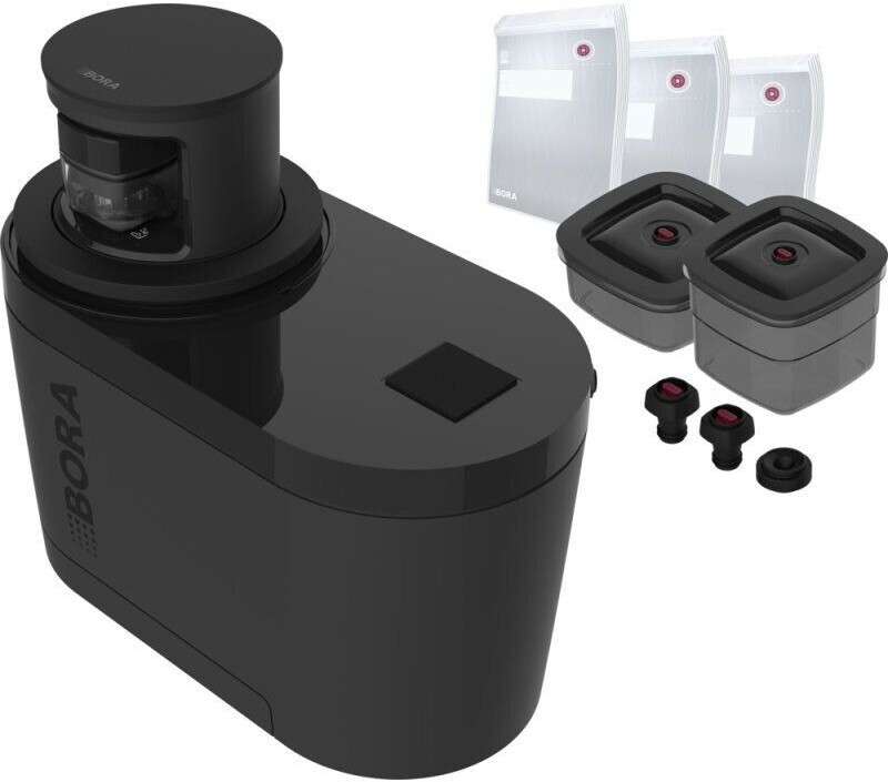 Das BORA QVac Vakuumierset All Black bietet eine umfassende Ausstattung für die effektive Lebensmittelkonservierung. Es umfasst neben dem BORA QVac Einbauvakuumierer auch Vakuumierboxen mit 1 und 2 Litern Fassungsvermögen, Vakuumierbeutel in den Größen 0,6 l, 1,5 l und 2,1 l, zwei Vakuumierverschlüsse sowie einen Marinier-Ring.
