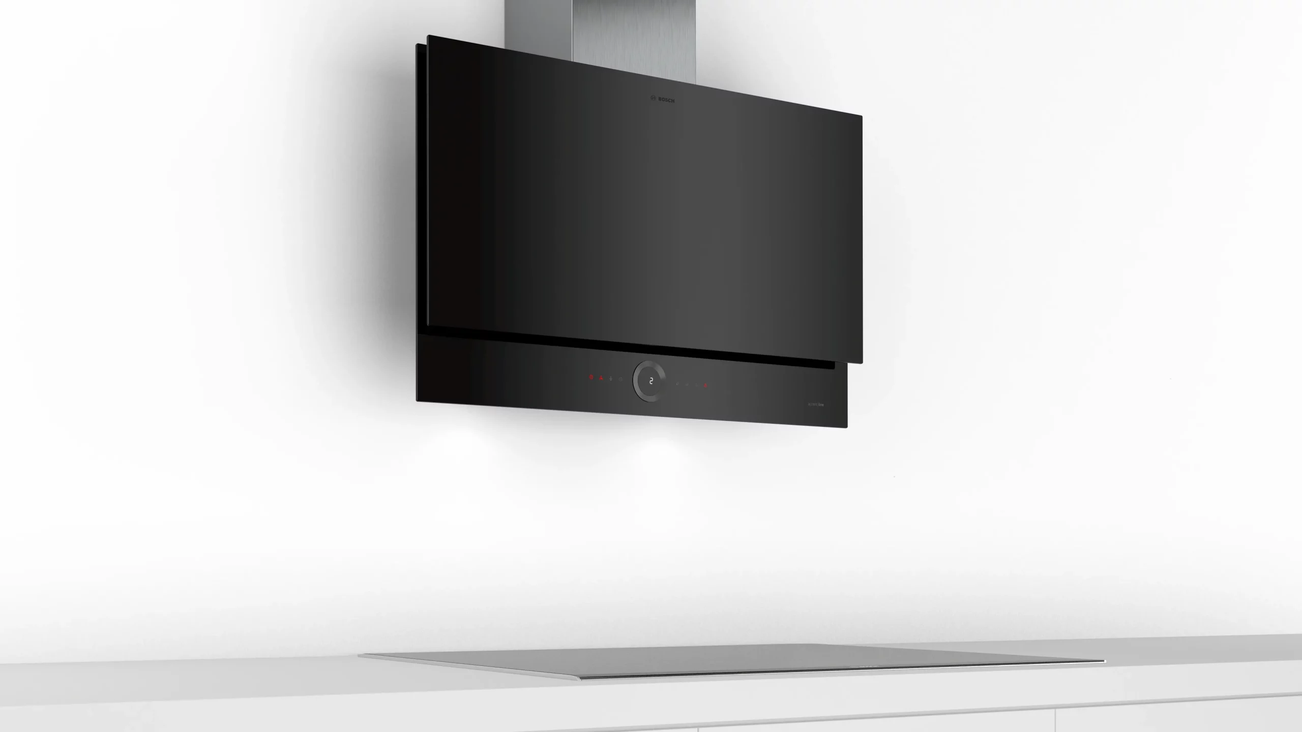 Die Bosch DWK98JQ66 ist eine hochwertige Wand-Dunstabzugshaube der Serie 6 mit einer Breite von 90 cm. Sie zeichnet sich durch ein modernes Design mit schwarzem Glas und einer Neigung von 45 Grad aus, was eine ergonomische Bedienung ermöglicht. Mit einer maximalen Abluftleistung von 836 m³/h sorgt sie für eine effektive Luftreinigung in großen Küchenbereichen. Die Haube bietet drei Leistungsstufen sowie eine Intensivstufe, die über ein benutzerfreundliches Touch-Control-System eingestellt werden.