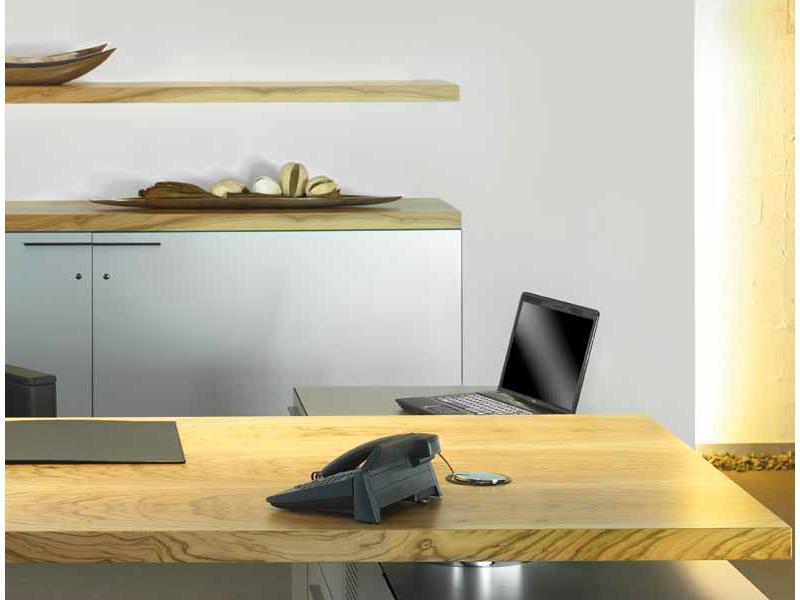Das Gehäuse besteht aus silberfarben eloxiertem Aluminium, während Wippdeckel und Manschette in elegantem Schwarz gehalten sind. Dieses zeitlose Design fügt sich nahtlos in verschiedene Einrichtungsstile ein. Die versenkbare Konstruktion ermöglicht es, die Steckdose bei Nichtgebrauch vollständig in der Arbeitsplatte verschwinden zu lassen, wodurch eine aufgeräumte Optik entsteht.