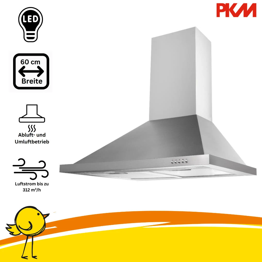 Die PKM Dunstabzugshaube 6090BZ ist eine moderne Wandhaube mit einer Einbaubreite von 60 cm, die sowohl im Umluft- als auch im Abluftbetrieb eingesetzt werden kann. Ihr puristisches Edelstahlgehäuse fügt sich harmonisch in jede Küchenumgebung ein. Die Haube verfügt über drei Leistungsstufen und erreicht eine maximale Abluftleistung von 312 m³/h, wodurch sie effektiv für eine frische und geruchsfreie Küche sorgt. Die integrierte LED-Beleuchtung mit zwei 0,5-Watt-Lampen bietet eine helle Ausleuchtung des Kochbereichs und trägt zur Energieeffizienz bei.